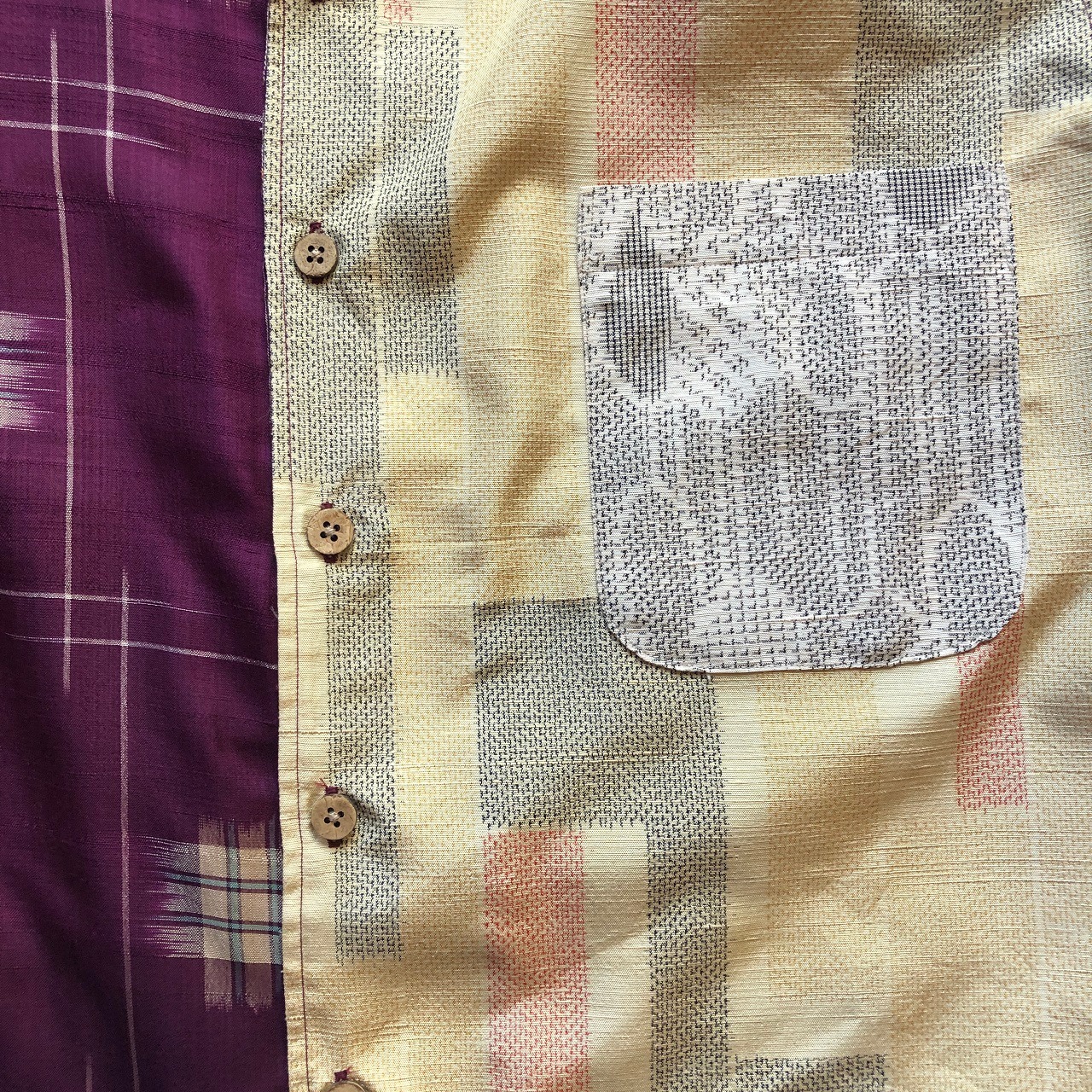 クリーム色と紫の紬地アロハシャツです。