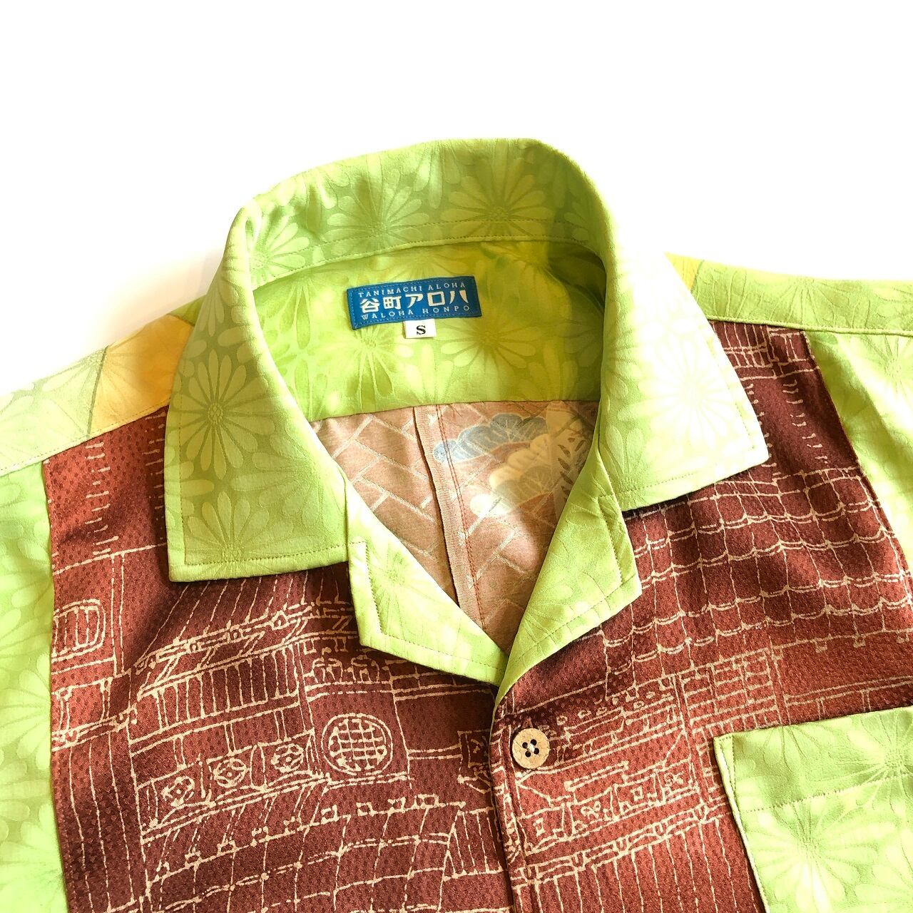 茶色と黄緑色の綸子アロハシャツ【S】