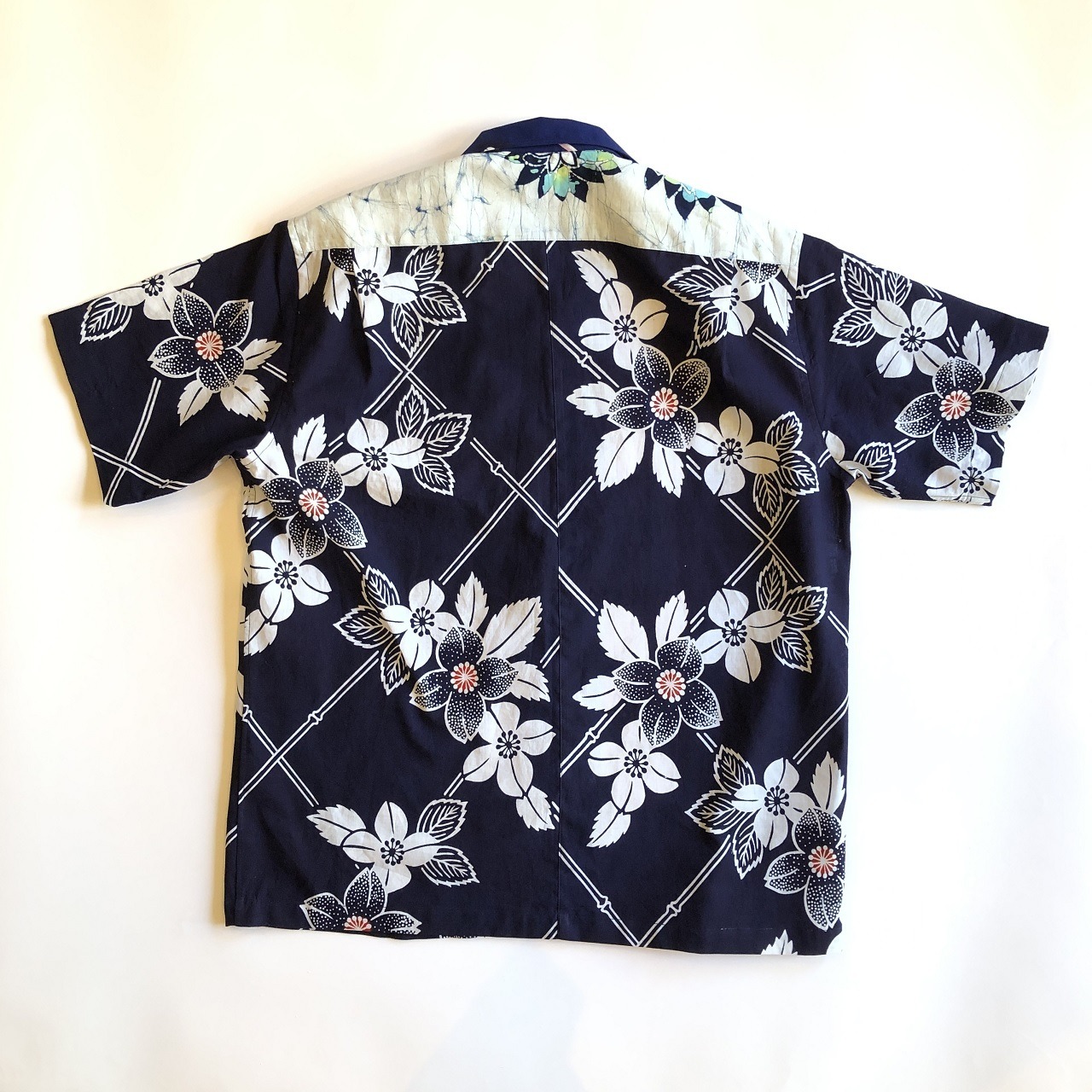 紺と淡いピンクの浴衣地アロハシャツ【L】