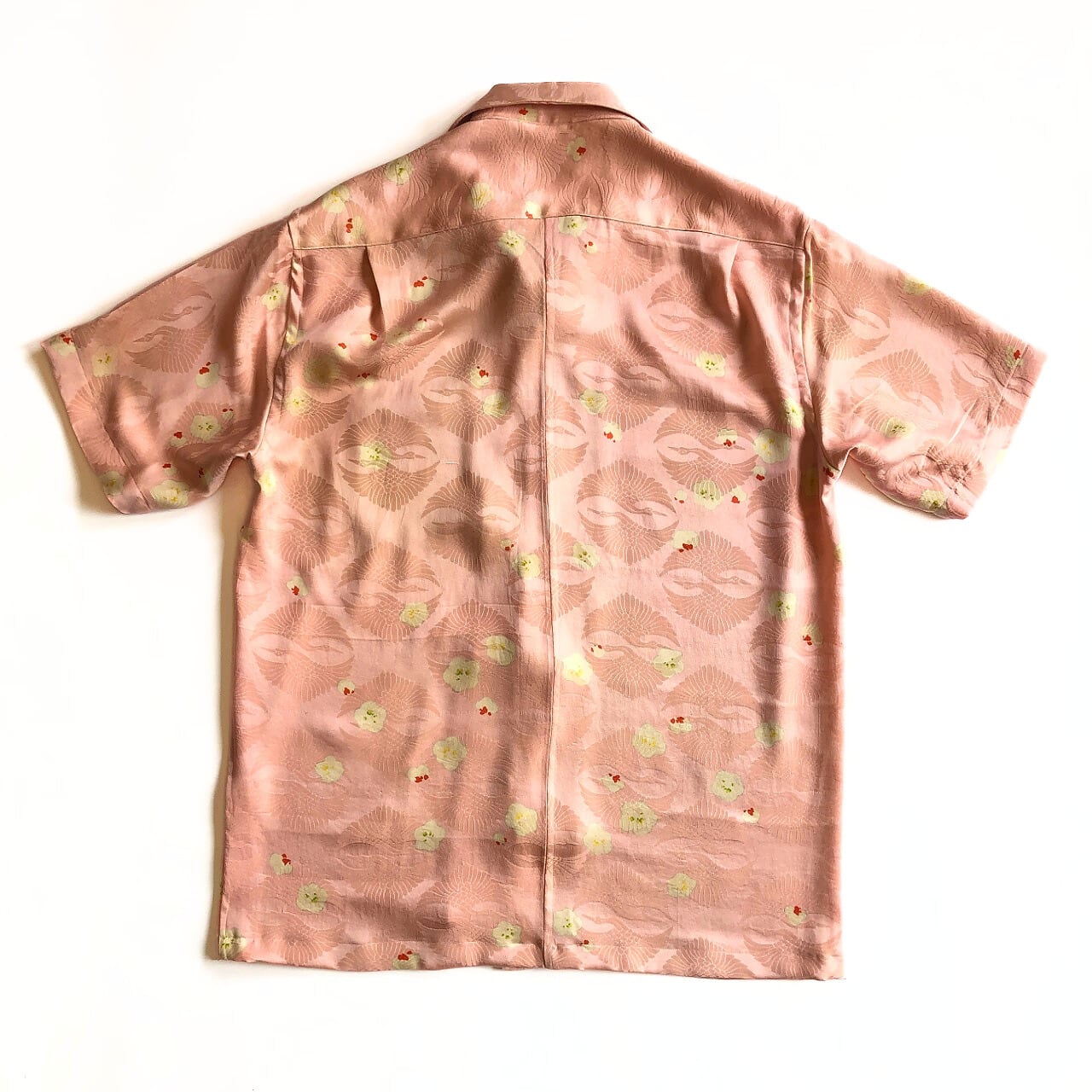 ピンクの鶴と梅花の正絹アロハシャツ【M】