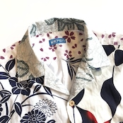 白地に紺色花と葉の浴衣地アロハシャツです。